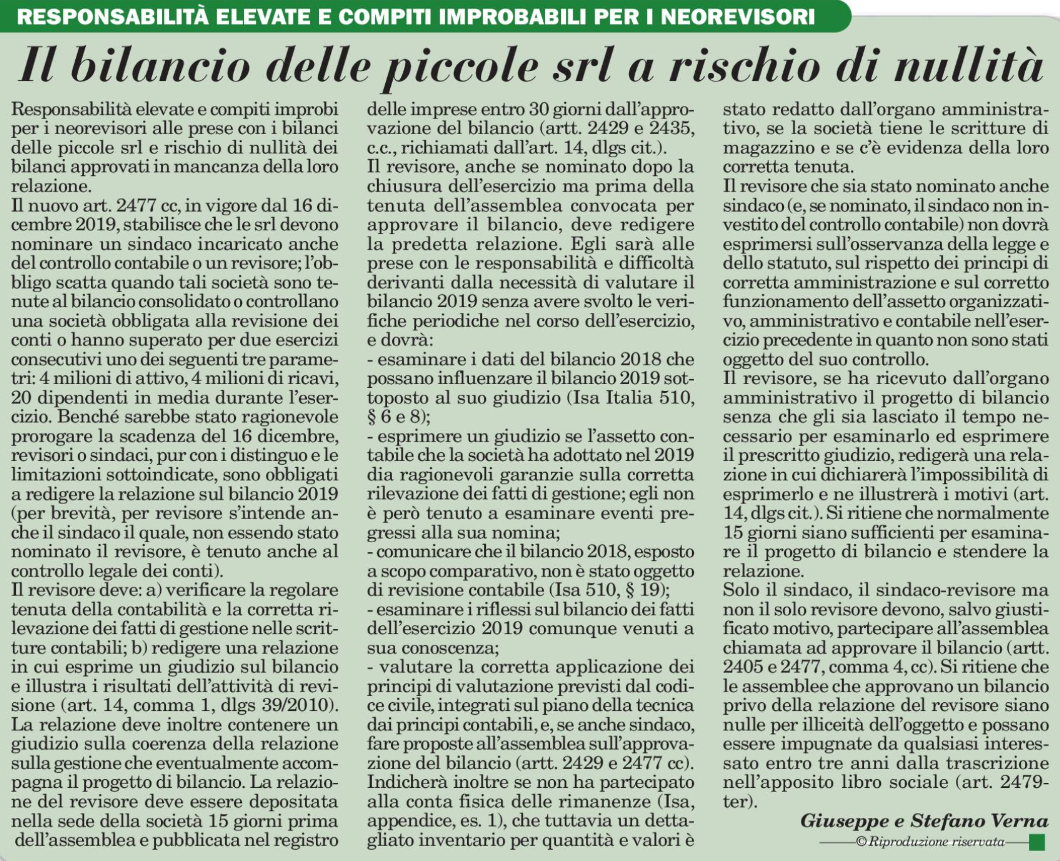 Segnaliamo l'intervento su Italia Oggi del 29/1/2020 di Giuseppe Verna e Stefano Verna: il bilancio delle piccole srl a rischio di nullità.